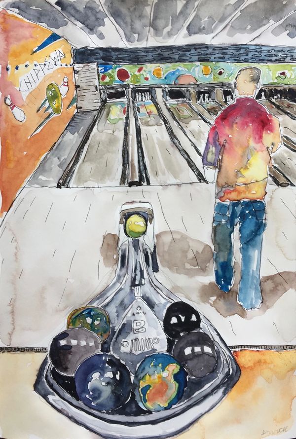 This image is a watercolor painting I made from a scene at our league night. Our team of English professors is called The Big Lebowskis.