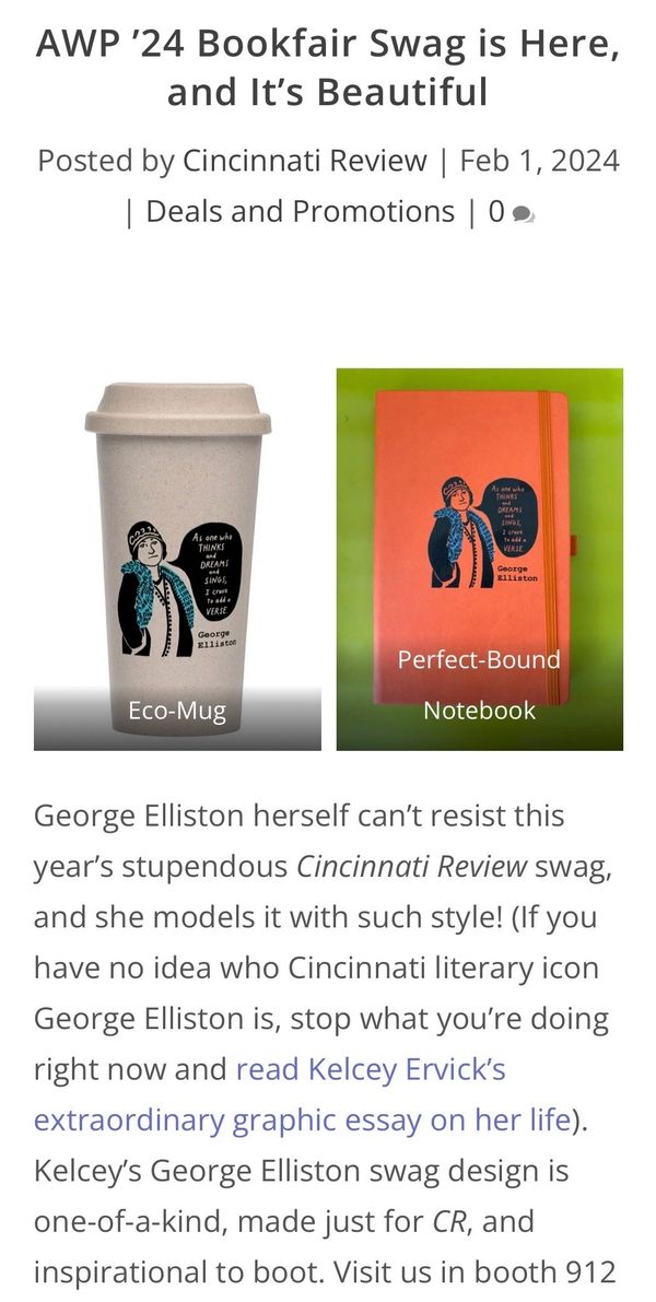 I created illustrations for an Indianapolis magazine and for merchandise for Cincinnati Review inspired by my graphic essay about the poet and "lady reporter," George Elliston.